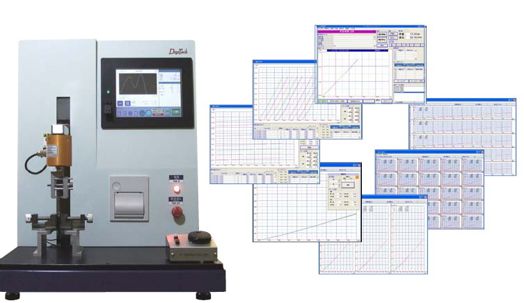 具备低成本, 操作容易的特点, 具有强大功能全新开发的小型桌上型荷重试验机, 在计算机上就可以进行各种条件设定, 设定后进行测试可以取得荷重相对于位移的波型,可以进行各种压缩试验, 拉伸试验, 破坏试验以及各种连接器的插拔力试验等, 测试后可取得最大值, 断裂值以及荷重-力量的图形, 并可以在波形上